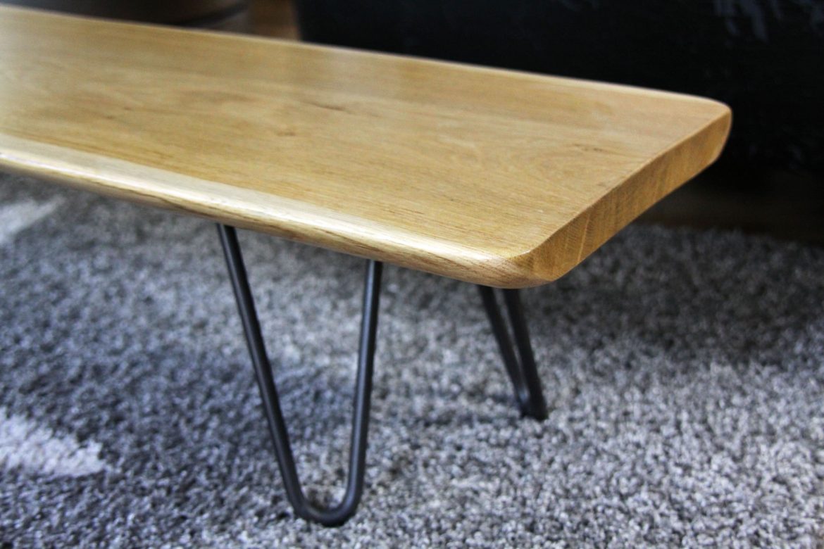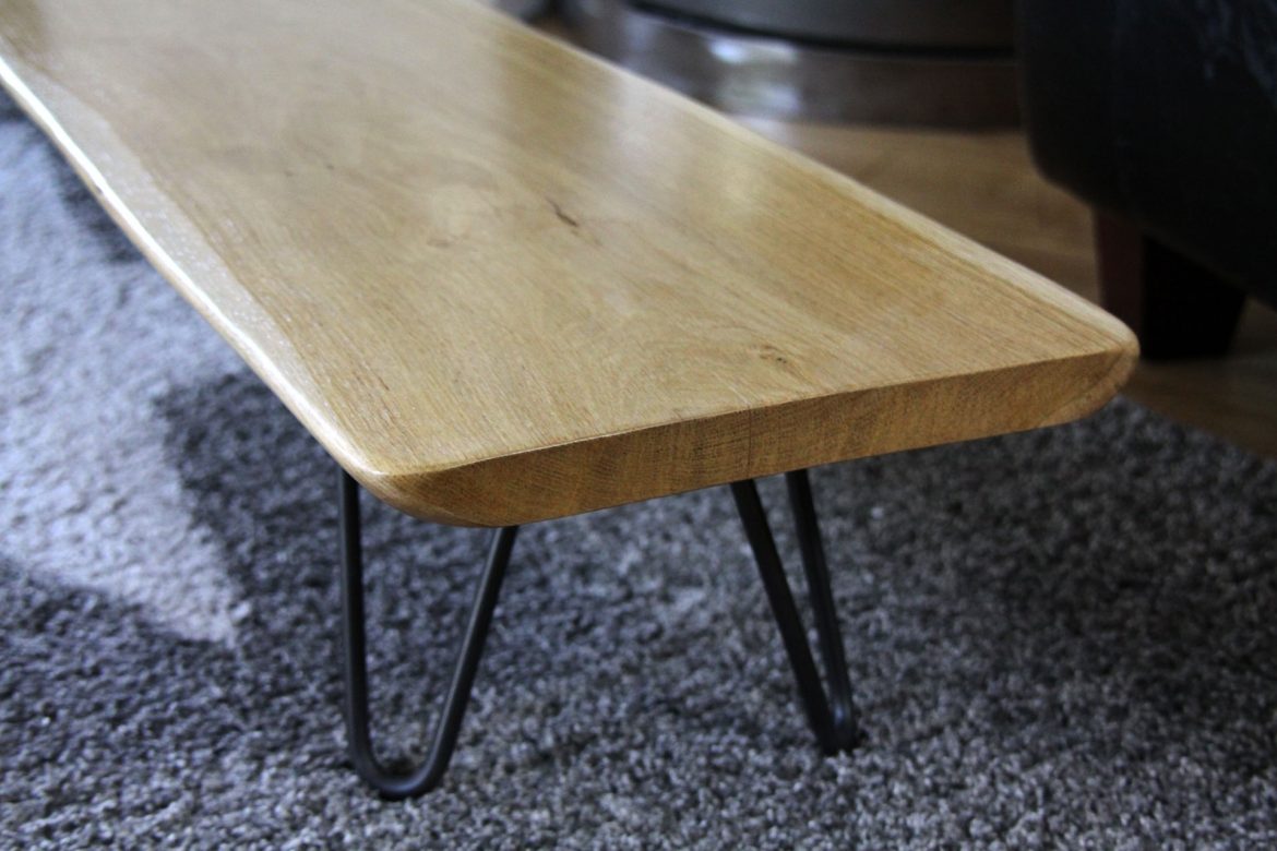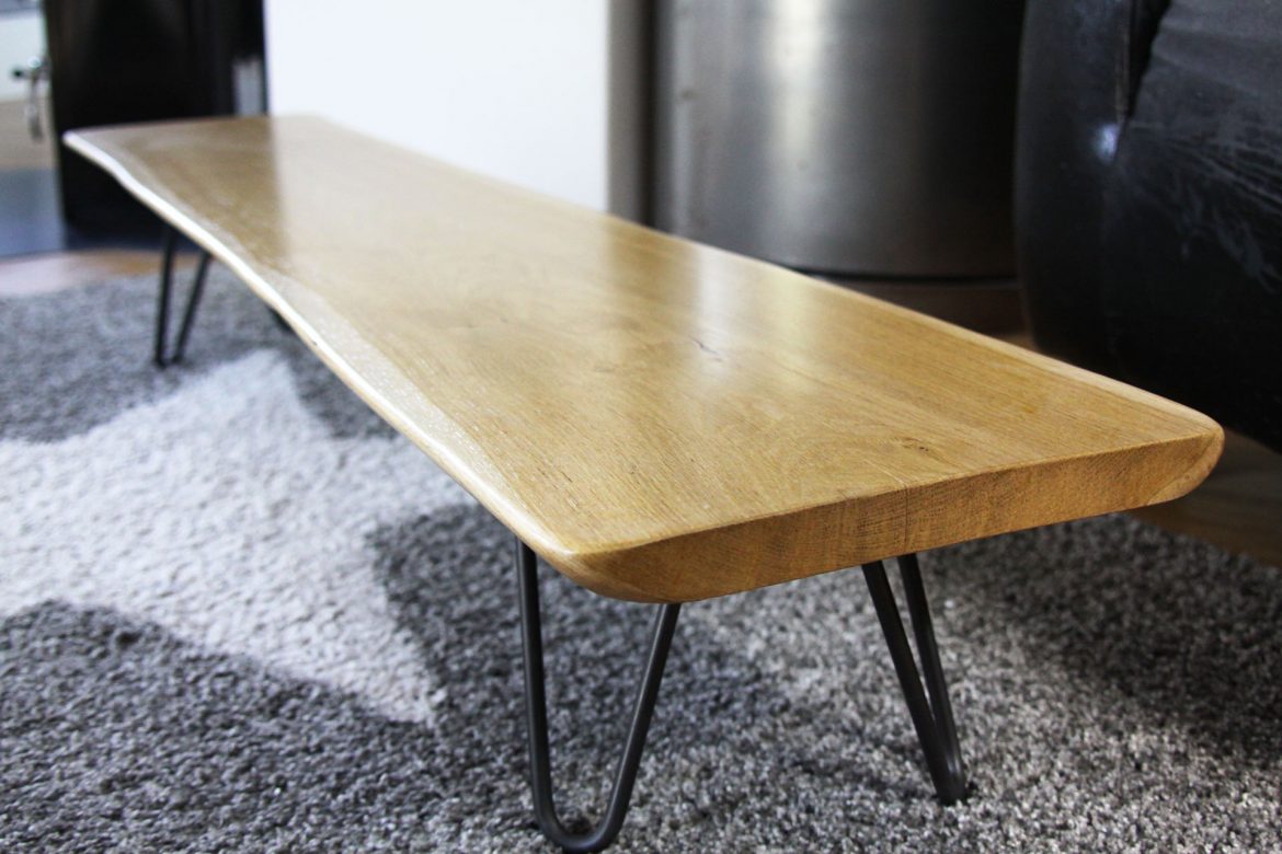 Massive Wohnelemente aus Eiche liegen voll im Trend des Vollholz Interior Designs. Alternativ kann die Tischplatte z.B. aber auch aus Esche oder Robinie gefertigt werden. Die Tischplatte wird aus getrockneten massiven Eichen-Bohlen für den Innenraum gefertigt. Die Bretter dieser Tischplatten bleiben möglichst naturbelassen und behalten absichtlich die sonst immer abgesägte Baumkante, das Splintholz, um das natürlich gewachsene Baumprofil zu erhalten. Die ursprünglich belassene Naturholzkante erzeugt zusammen mit der warmen Eiche-Optik ein bodenständiges und gemütliches Wohnambiente.