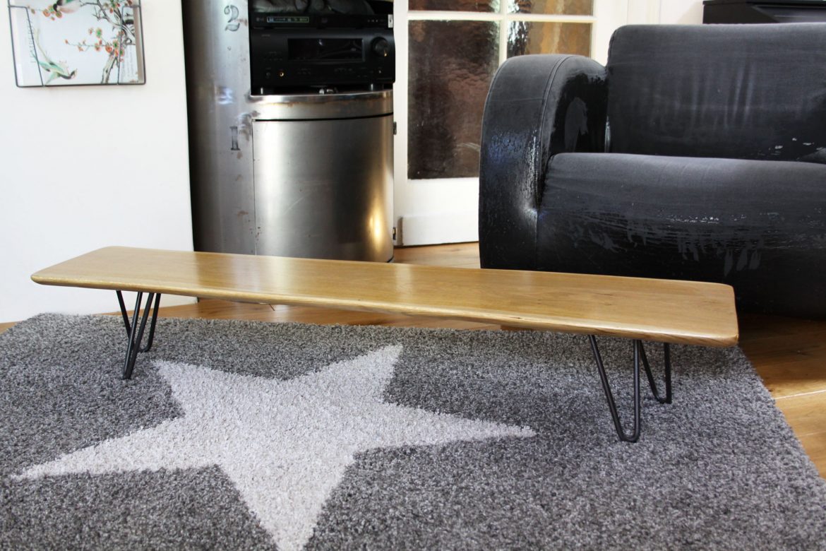 Sie geben uns Ihre Wunschmaße für den Tisch an und wir versuchen diesen für Sie zu bauen. Je nach Tiefe muss dafür die Baumscheibe jedoch verleimt werden. Das sprechen wir ggf. gerne mit Ihnen ab. Für die Füße werden Hairpin-Legs im Stil der 60er Jahre verwendet. Diese gibt es in Höhen zwischen 15 und 100cm. Geben Sie uns einfach die gewünschte Tischhöhe an.