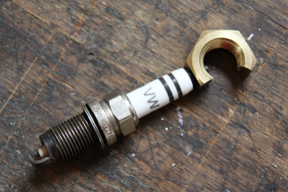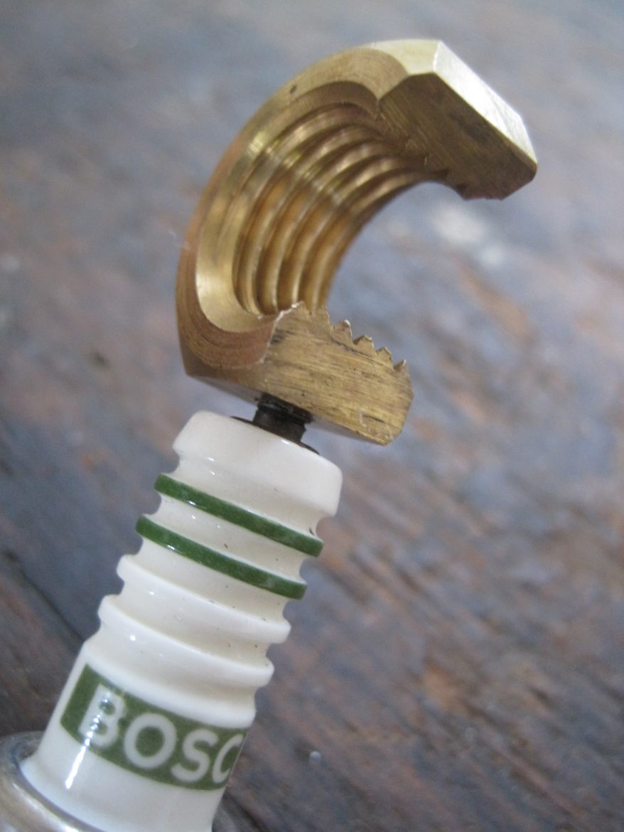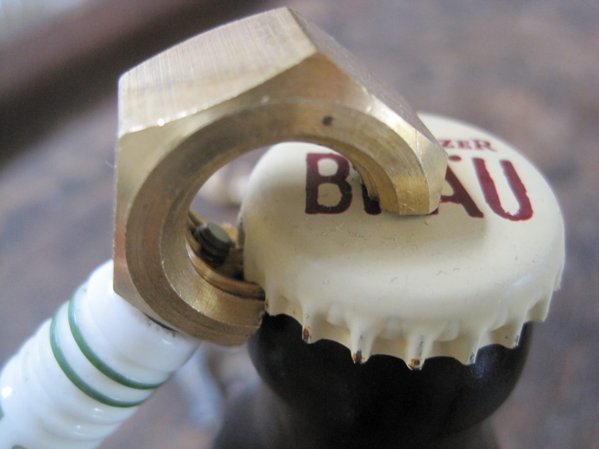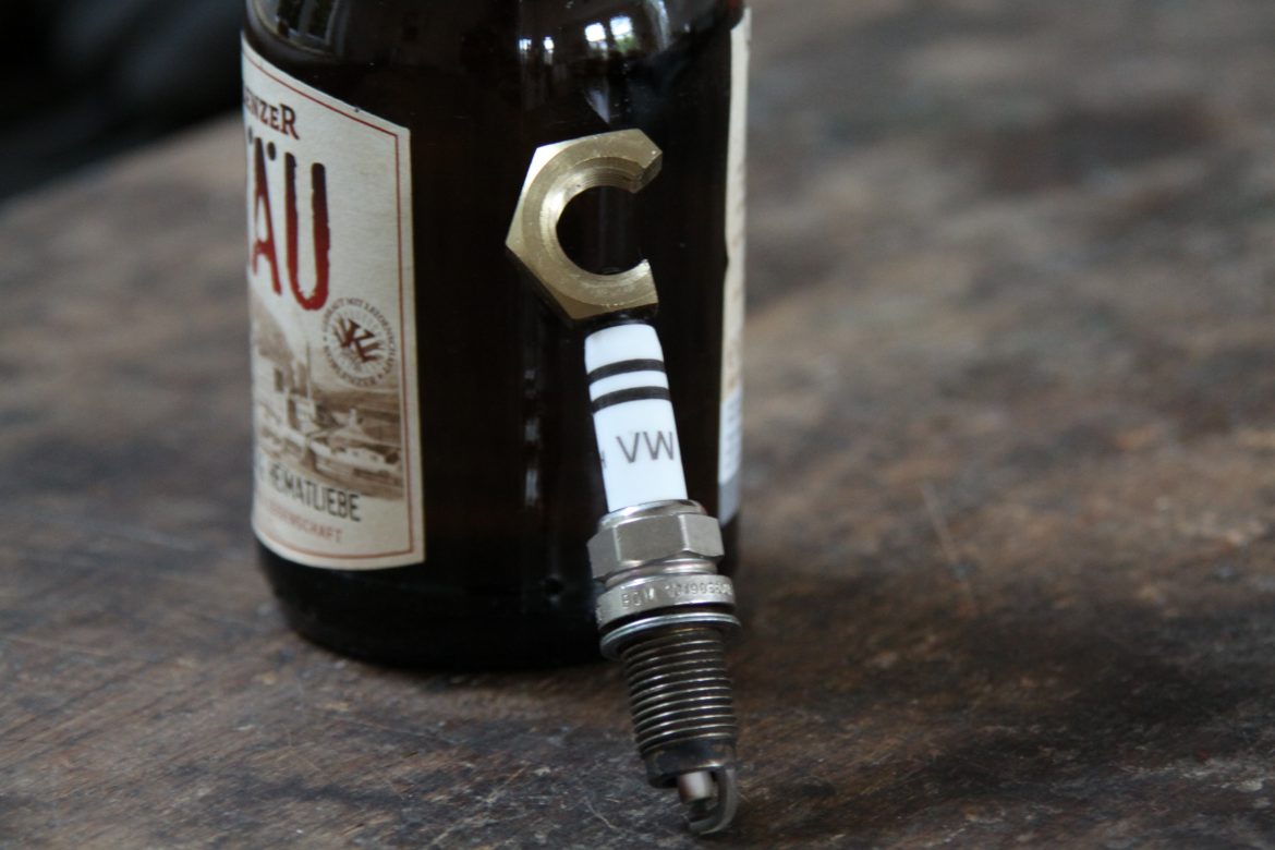 Der Flaschenöffner besteht aus einer alten Zündkerze, die garantiert mindestens 30.000 km und mehrere Millionen Zündfunken hinter sich hat und einer Messing- oder Stahlmutter, die nur darauf wartet nach Feierabend das erste Bier zu zünden (Anmerkung: wir haben´s ausprobiert, der Öffner funktioniert auch bei anderen Getränkeflaschen, sogar bei alkoholfreiem Bier).